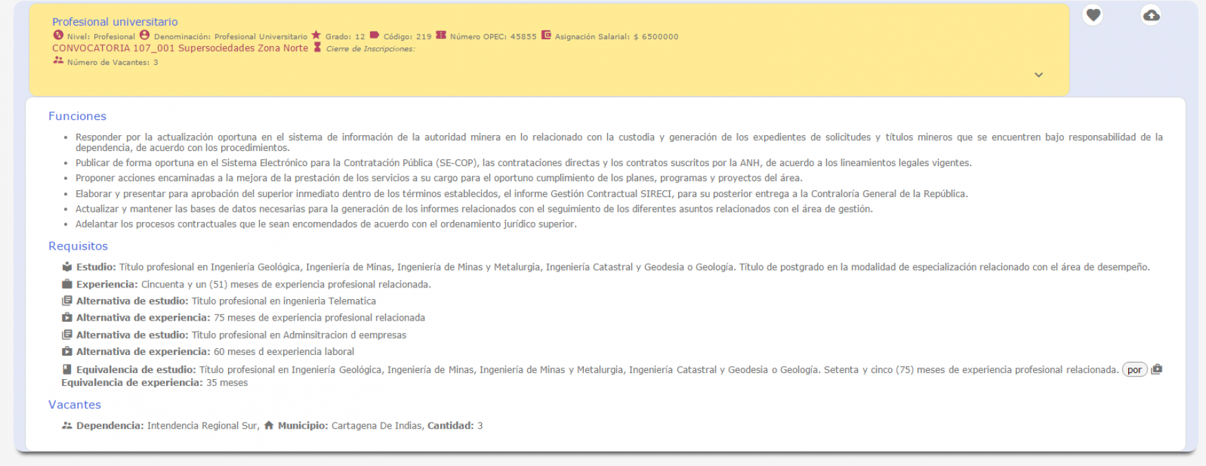 , podrá observar toda la información relacionada con el empleo como por ejemplo salario, requisitos, vacantes, entre otros datos; si el ícono es