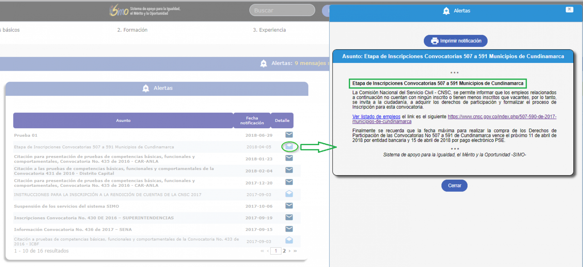 - Convocatoria: Nombre de la convocatoria a la que pertenece el empleo seleccionado por el ciudadano