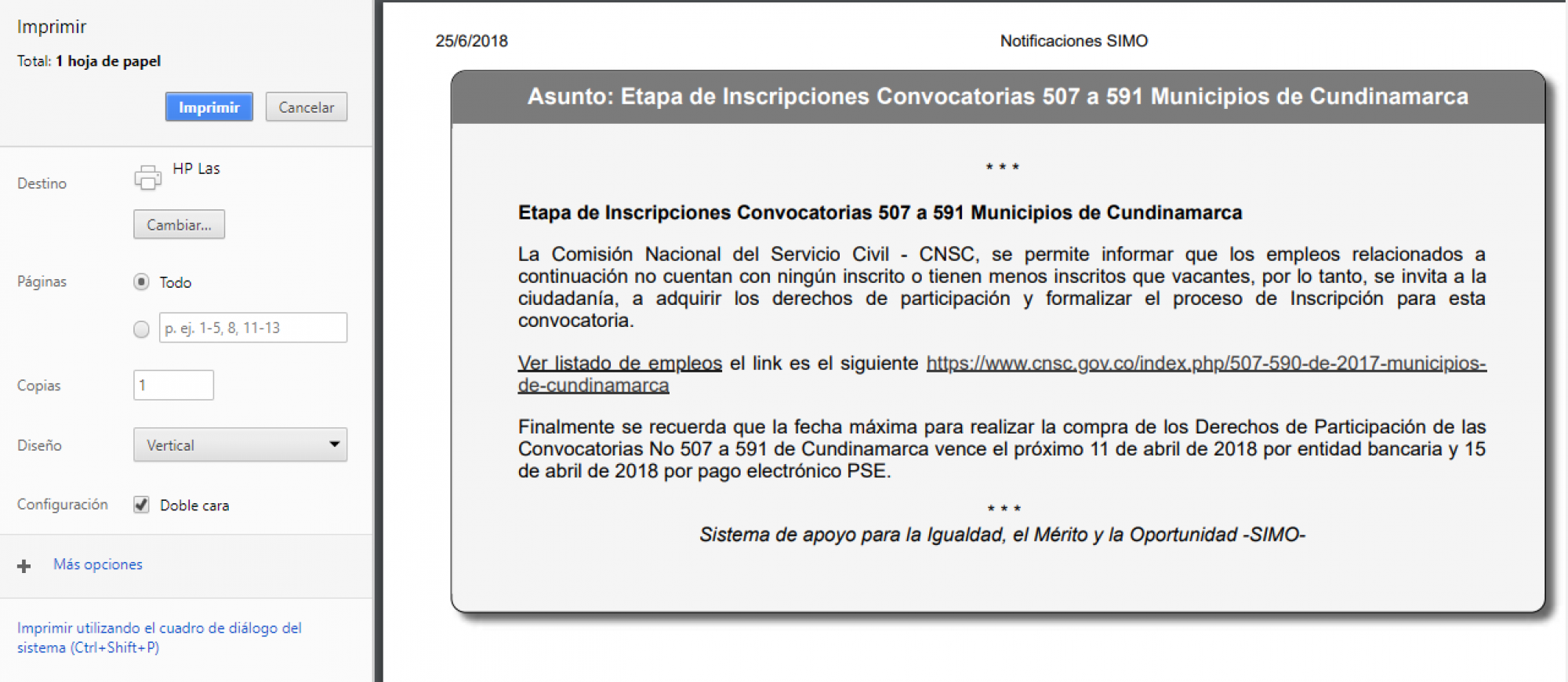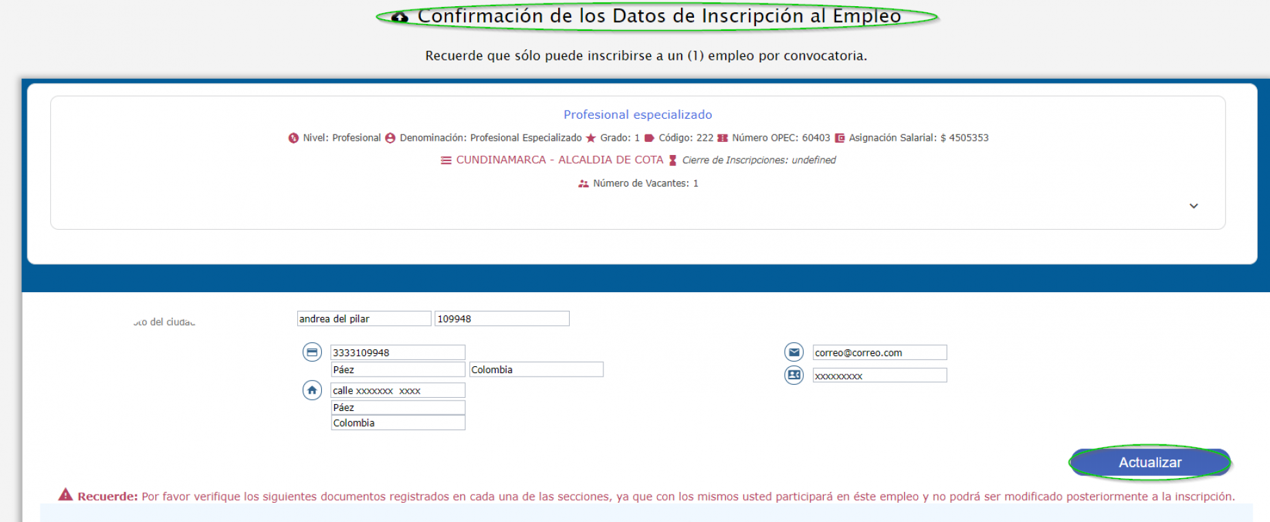 Un usuario solo puede inscribirse a un empleo por convocatoria. Por lo tanto una vez el usuario confirma la operación de inscripción, el sistema bloque esta opción para los demás empleos de la convocatoria.
