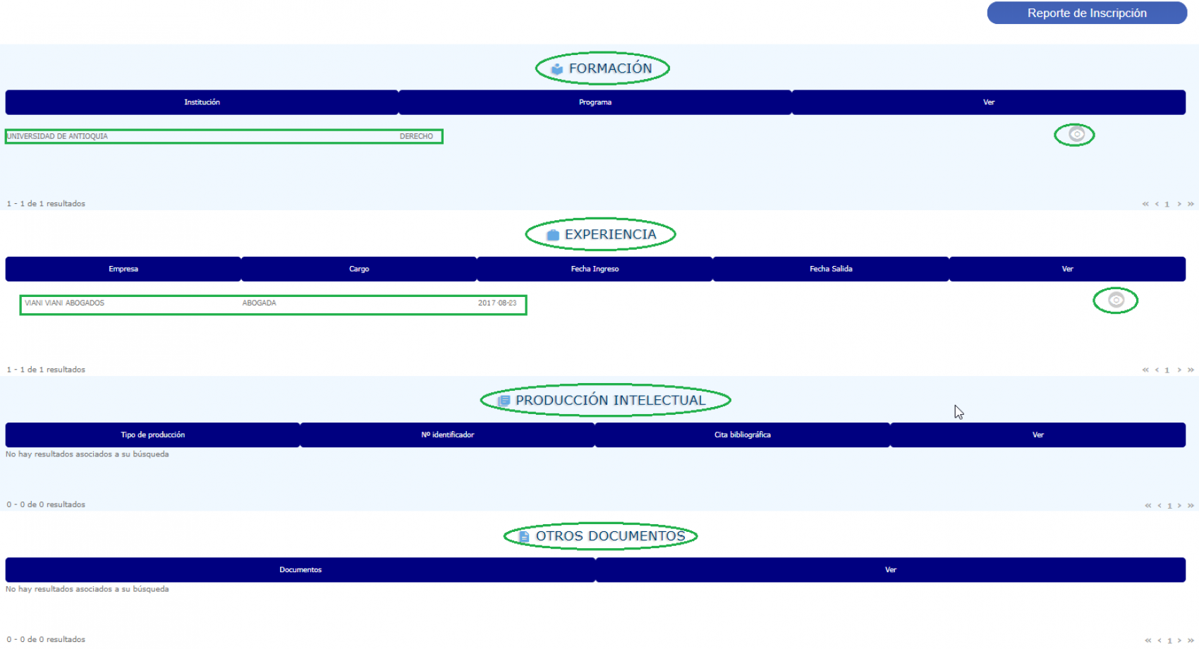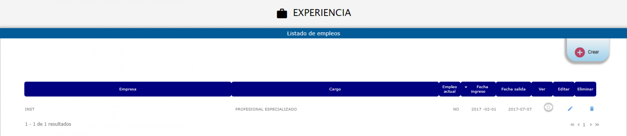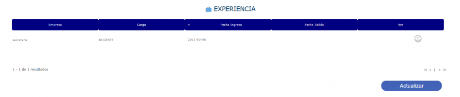 La información se ve reflejada en la tabla correspondiente a Experiencia desde la cual se podrá: