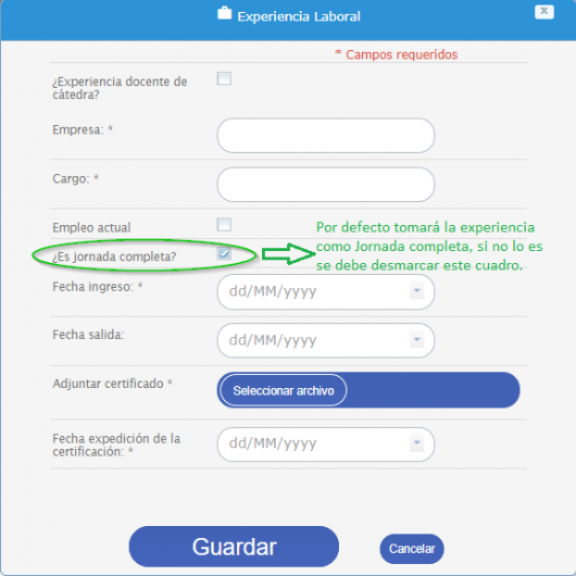 Para finalizar la creación se debe dar clic en el botón Guardar, el sistema valida la información y si cumple con los parámetros establecidos es registrada en la Hoja de Vida del Usuario.