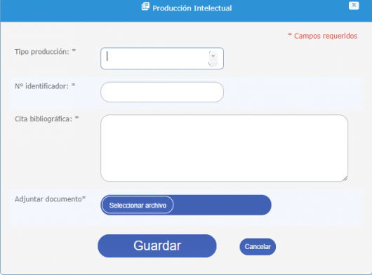 Para registrar y/o modificar la información correspondiente a escritos y/u obras que haya producido el usuario, se debe acceder desde la sección “Producción Intelectual” del menú lateral o desde el icono del tablero del control.