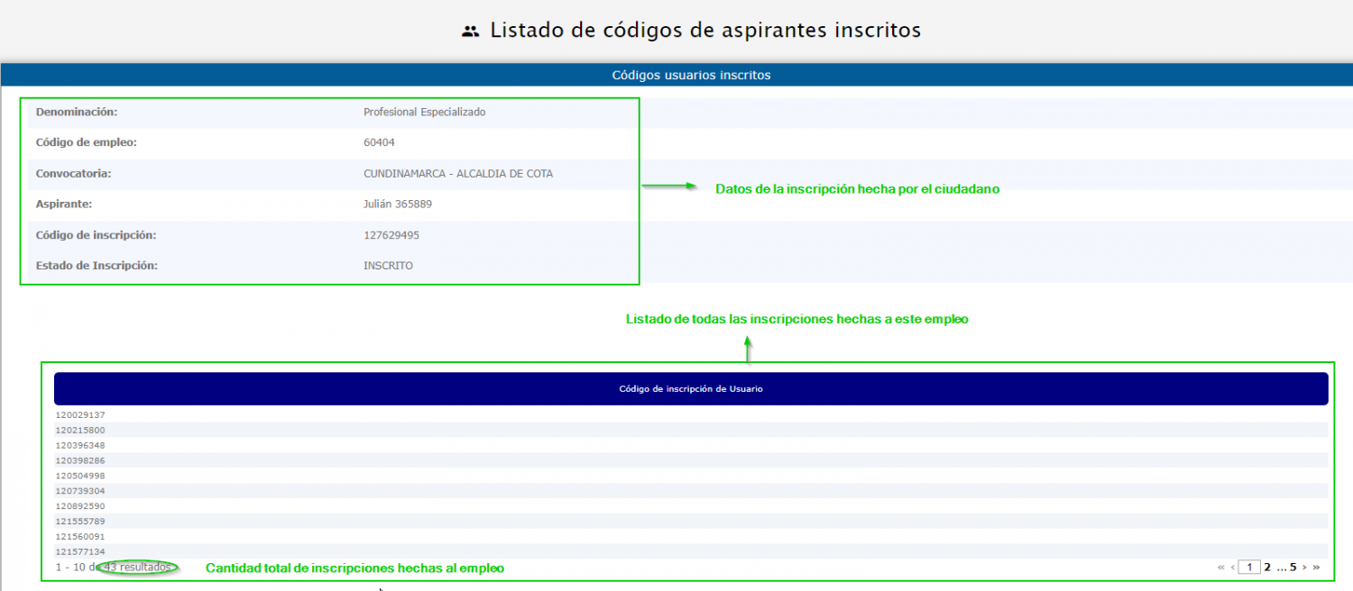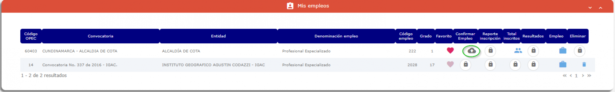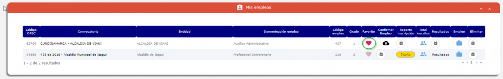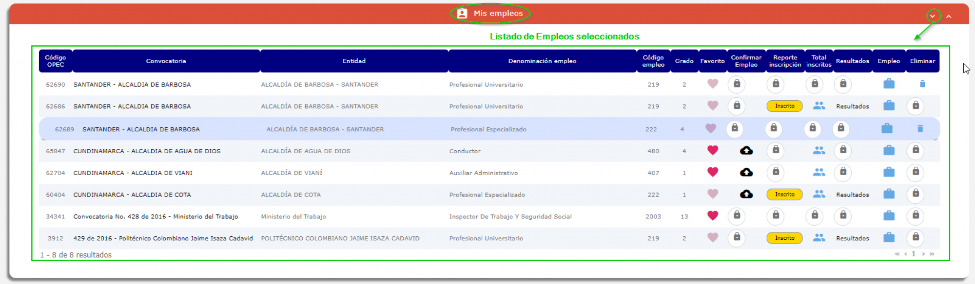 , el sistema listará todas las inscripciones hechas al empleo seleccionado; si el ícono es