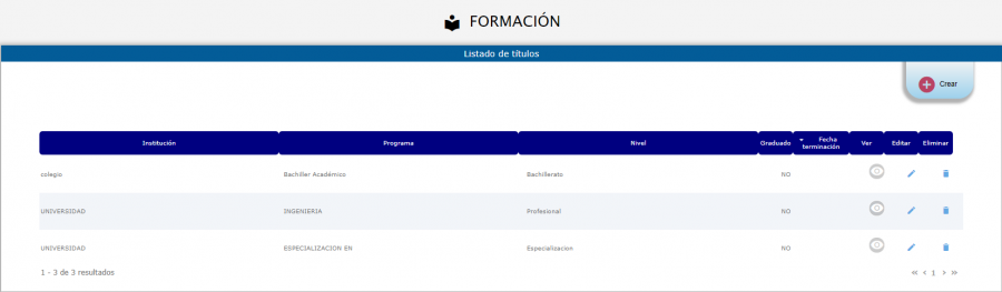 La información se ve reflejada en la tabla correspondiente a Formación desde la cual se podrá: