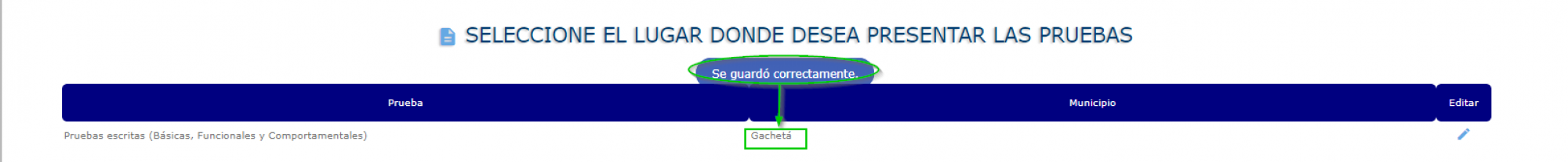 El usuario debe seleccionar el municipio en el cual presentara cada prueba ingresando desde el icono