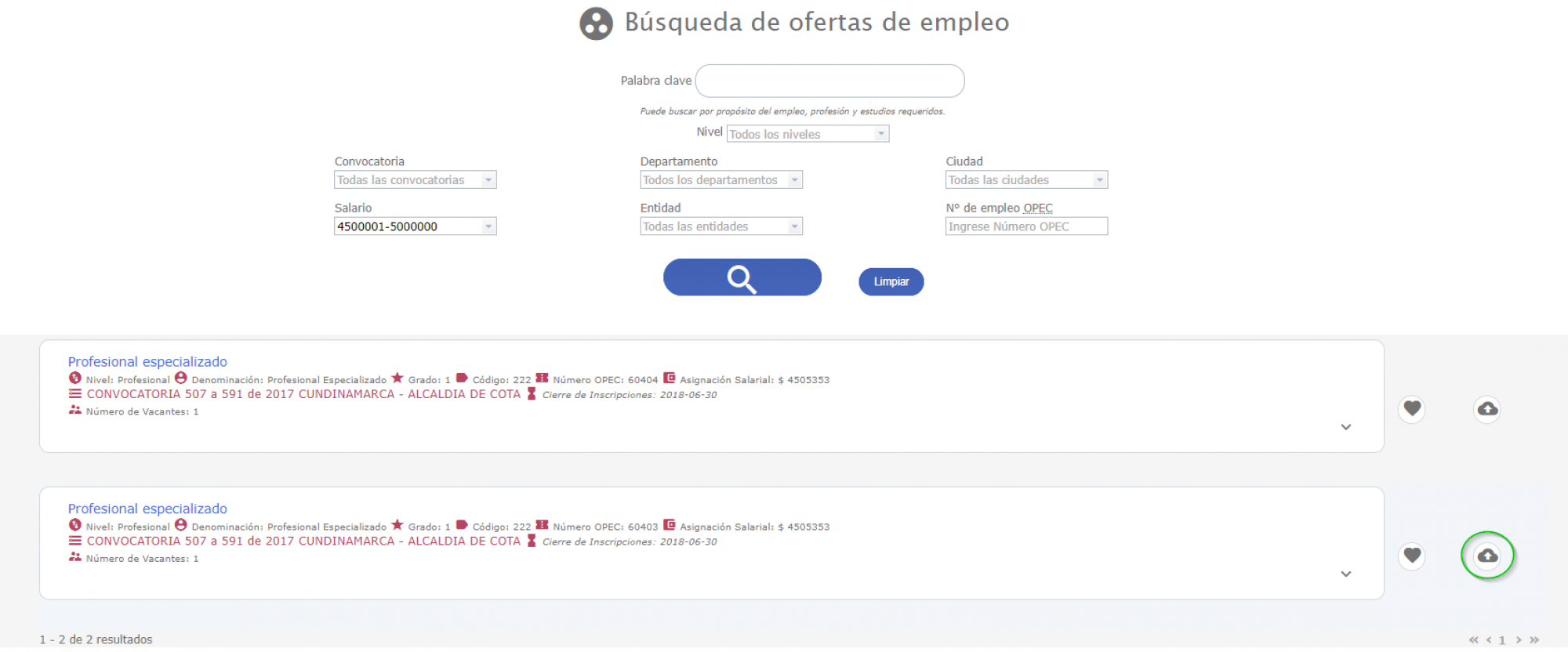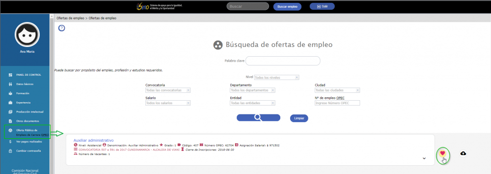 Asociada a la Oferta Publica de Empleos de Carrera - OPEC el usuario puede realizar las siguientes operaciones: marcar como favorito, ó seleccionar el empleo.