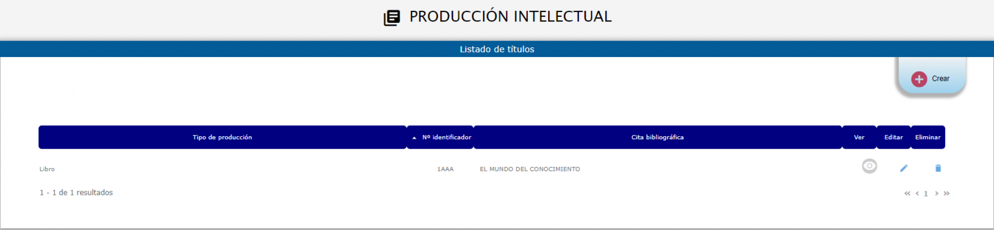 La información se ve reflejada en la tabla correspondiente a Producción Intelectual desde la cual se podrá: