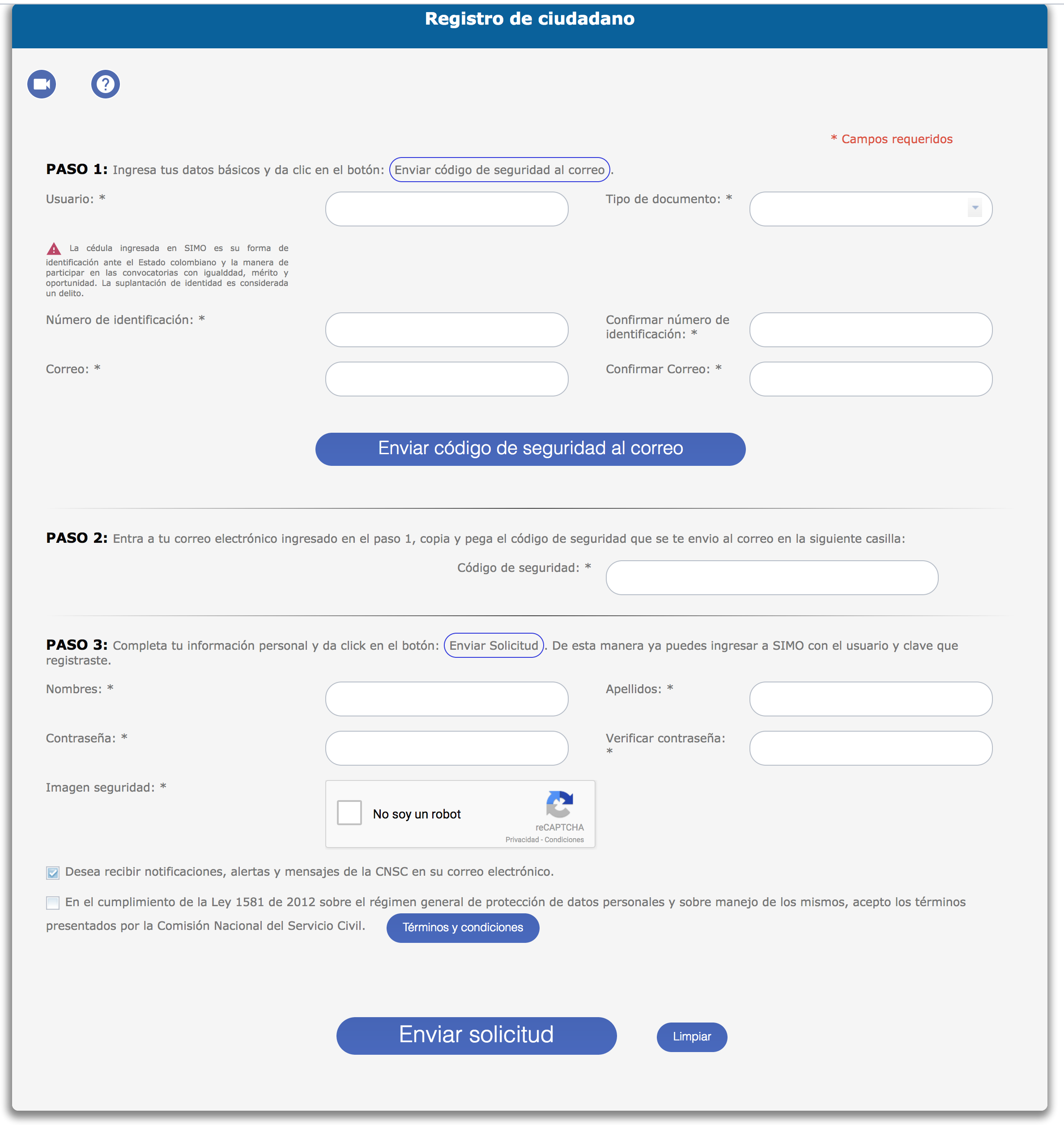 Copie el código de seguridad en el campo correspondiente y continue diligenciando todos los campo del formulario que presenta el sistema: