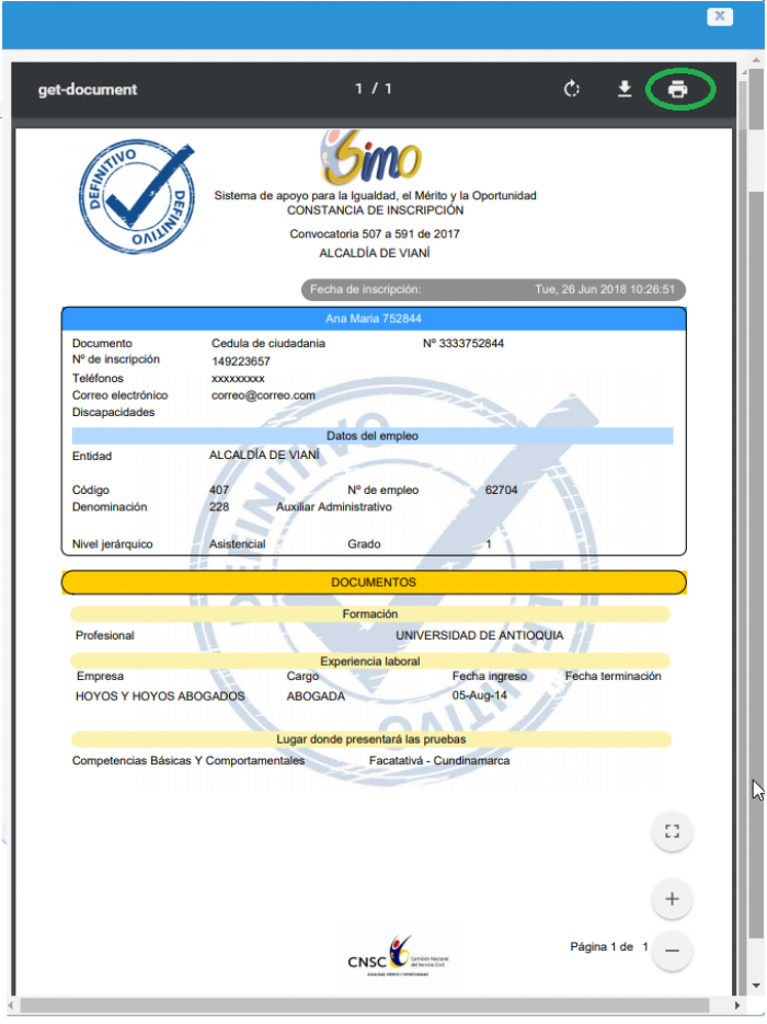 , indica que el ciudadano se inscribió a ese empleo, ingresando a este botón el ciudadano puede generar su reporte de inscripción definitivo y observar los documentos con que se inscribió al empleo; si el ícono es
